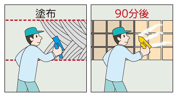 - ●冬季に硬化促進剤を併用する場合は、接着剤を混練用板等に絞り出し、接着剤1本に対して硬化促進剤1袋を添加して良く混練してください。混練後は直ちに塗布しタイル張りしてください。