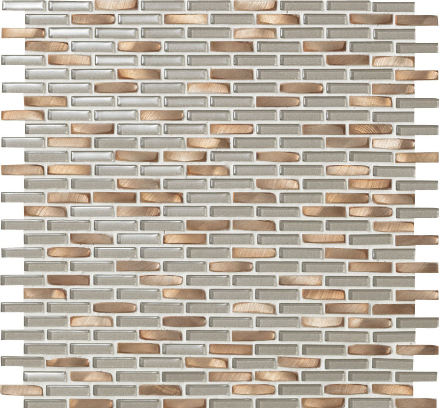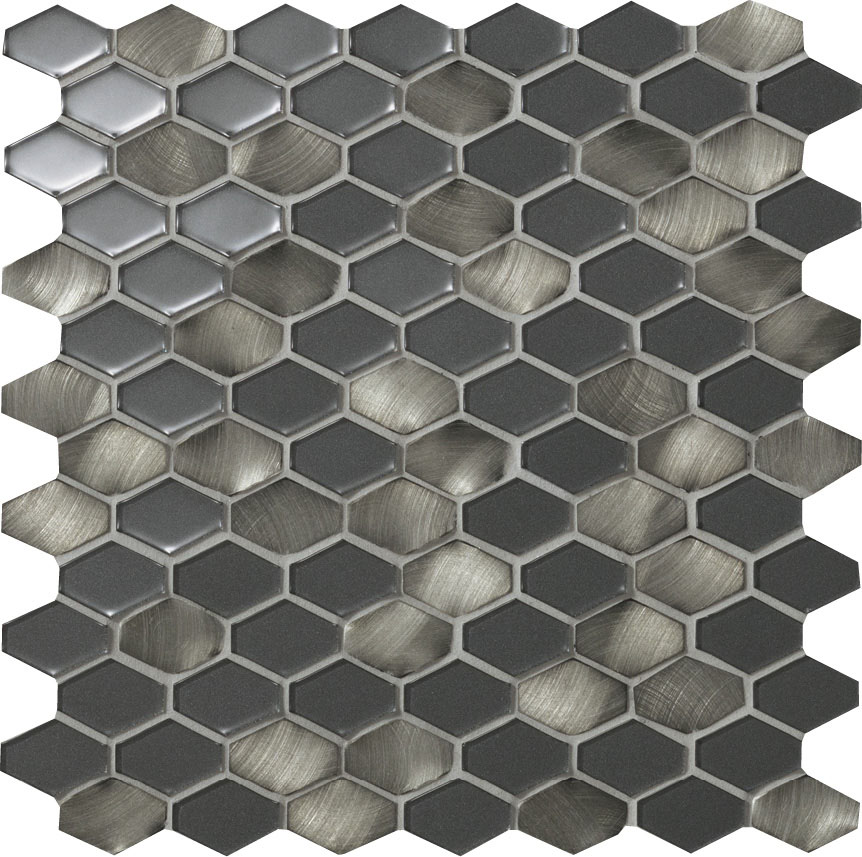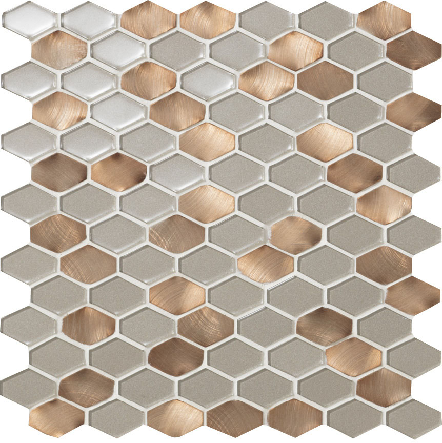 - ●ガラスと塗装されたアルミニウムをミックスしています。素材により形状・厚さのバラツキがあります。特に変形六角形はガラスモザイクとアルミモザイクの大きさに差があり、目地の幅に大きなバラツキがあります。